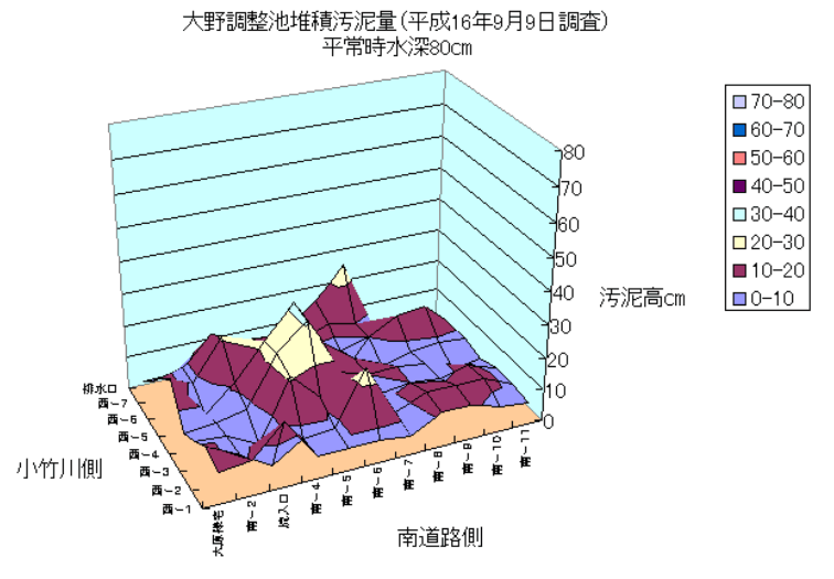 佐倉調整池実験追加 (平成16年9月9日) 平成16年9月9日、バイオファンスーパー60W型1基設置稼動。 動かし始めは、底泥を表層に巻き上げるものの、翌日には一様化し安定してきた。 バイオファン60W1基で、この調整池の水は1日30回転以上循環することになる。 同時に底泥高を調査した。実験期間中にこの底泥の量と質に変化があるかを追跡する予定。