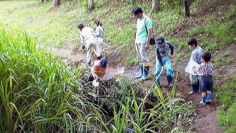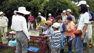 昼食後のひと時、 川の中にアミを入れる子どもたち。 何がいるかな? |