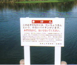 ところが最近、左のような看板が、池のところに立てられました。平成13年に設置した浄化施設からの処理水を流入したのが原因のようで、透明度は良いのですが、実際の環境は悪化しているようです。