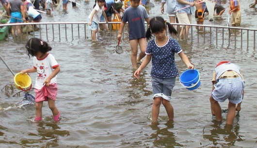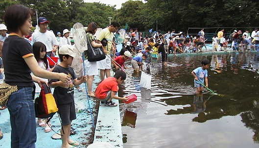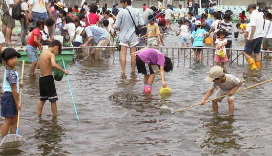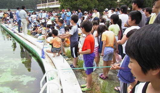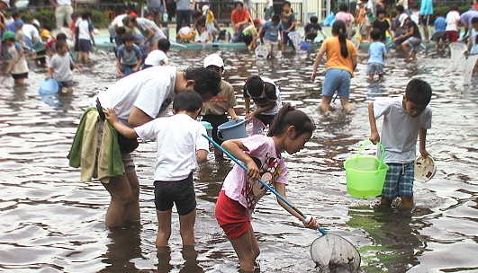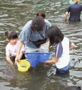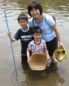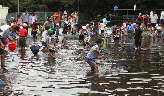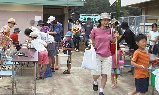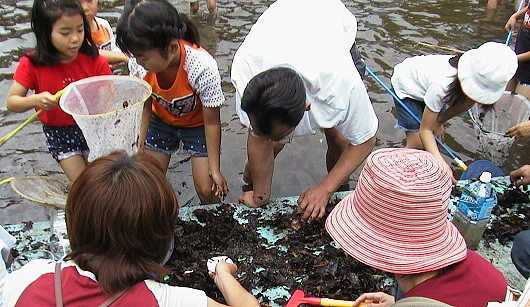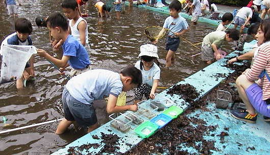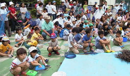 ←プールの中には、 ヤゴのほか、アメンボ やオタマジャクシ、フウ センムシ等もいて、子 どもたちは大喜びで した。 |